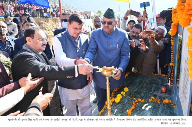 मुख्यमंत्री पुष्कर सिंह धामी एवं भाजपा के राष्ट्रीय अध्यक्ष जे.पी. नड्डा ने सोमवार को सवाड़ चमोली में सैन्यधाम निर्माण हेतु आयोजित शहीद सम्मान यात्रा का शुभारम्भ किया। इस अवसर पर सवाड़ में शहीद स्मारक पर शहीदों को श्रद्धांजलि दी गई। शहीदों की स्मृति में दो मिनट का मौन भी रखा गया। कार्यक्रम के दौरान शहीदों के परिजनों को सम्मानित भी किया गया। इस अवसर पर केन्द्रीय रक्षा राज्य मंत्री अजय भट्ट, कैबिनेट मंत्री गणेश जोशी, भाजपा के प्रदेश अध्यक्ष/विधायक मदन कौशिक भी उपस्थित थे।