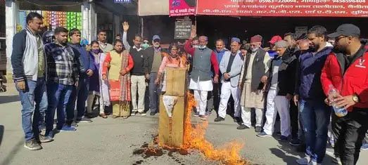 कांग्रेस जिला कमेटी ने आम आदमी पार्टी के प्रदेश प्रभारी दिनेश मोहनिया की टिप्पणी पर कड़ी आपत्ति जताई है। नाराज कार्यकर्ताओं का कहना है कि उन्होंने पूर्व मंत्री यशपाल आर्य पर अभद्र टिप्पणी की है। उनका यह बयान हास्याप्रद है। उन्होंने दिए गए बयान पर माफी मांगने की मांग की है। मांग पूरी नहीं होने पर बड़े आंदोलन की चेतावनी दी है। बुधवार को कांग्रेस के जिलाध्यक्ष लोकमणि पाठक के नेतृत्व में कांग्रेस कार्यकर्ता एसबीआइ तिराहे पर एकत्र हुए। यहां उन्होंने नारेबाजी की और आप के मोहनिया का पुतला दहन किया। वक्ताओं ने कहा कि देवभूमि उत्तराखंड को कलंकित करने वाली पार्टियों को जनता कभी माफ नहीं करेगी। महंगाई, बेरोजगारी पर सरकार को घेरने के बजाए आप नेताकांग्रेस के नेताओं पर अभद्र टिप्पणी कर रहे हैं। जिसका खामियाजा उन्हें आगामी विधानसभा चुनाव में भुगतना पड़ेगा। इस मौके पर अर्जुन भट्ट, भैरव नाथ टम्टा, कवि जोशी, ललित फर्स्वाण, हरीश ऐठानी, गीता रावल, धीरज कुमार, रतन सिंह किरमोलिया, दयाल बिष्ट, इंद्रा जोशी, गीतांजलि, विनोद पाठक, सुरेश लाल आदि मौजूद थे।