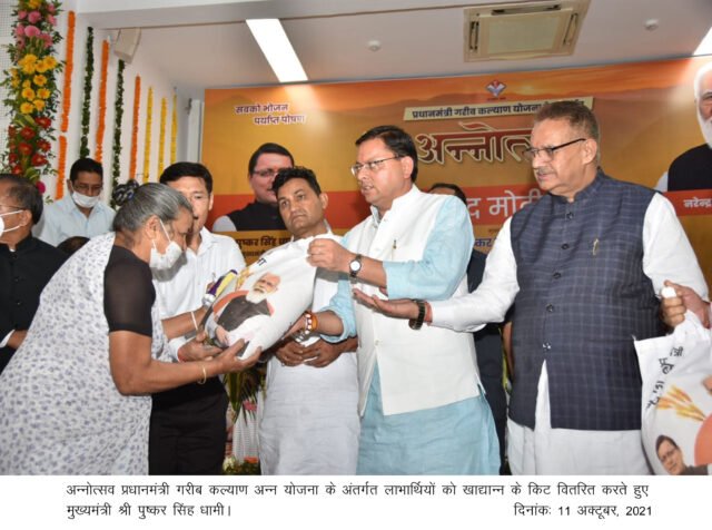देहरादून। मुख्यमंत्री पुष्कर सिंह धामी ने अन्नोत्सव प्रधानमंत्री गरीब कल्याण अन्न योजना के अंतर्गत लाभार्थियों को खाद्यान्न के किट वितरित किये। जनता दर्शन हाल सीएम आवास में आयोजित कार्यक्रम में मुख्यमंत्री ने छः लाभार्थियों को किट प्रदान किये। इसी प्रकार अन्नोत्सव कार्यक्रम में सम्पूर्ण माह राज्य की समस्त 9230 राशन की दुकानों के माध्यम से नि शुल्क खाद्यान्न का वितरण किया जाएगा। कुल 14 लाख राशन थैलों का वितरण होगा।